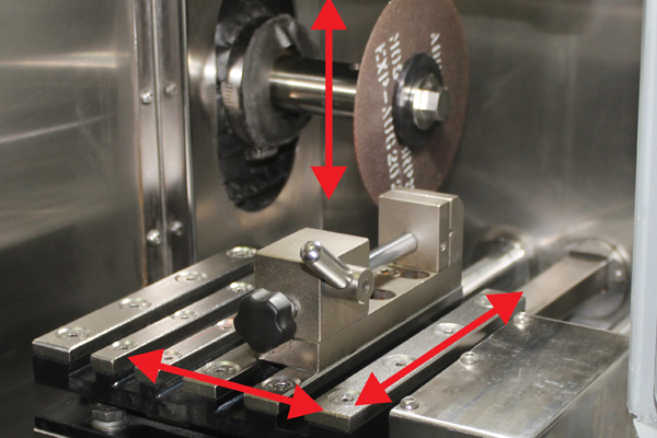 The machine accepts samples up to a 50 mm diameter; for larger or irregular geometries, the included fixture options and the movable T-slot cutting table (200 x 200 mm) provide flexible clamping and positioning.
