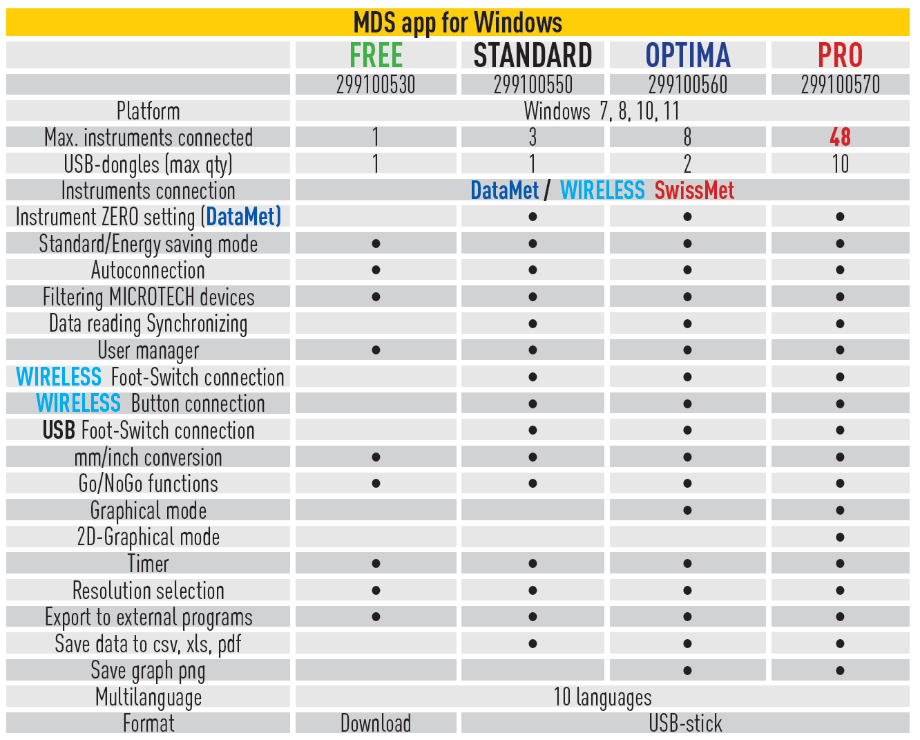 The app runs on Windows 7, 8, 10 and 11 and supports connection of up to 8 instruments with a maximum of 2 USB dongles. Supported connection modes include DataMet and WIRELESS SwissMet, and optional hardware such as footswitches and DataMet buttons can be used to collect data or set Zero remotely. Practical features like mm/inch conversion, Go/NoGo functions, graphical mode, timer and resolution selection make the software adaptable to workshop, lab and production environments. For integration, exports are available as CSV, XLS and PDF and graphs can be saved as PNG for documentation.