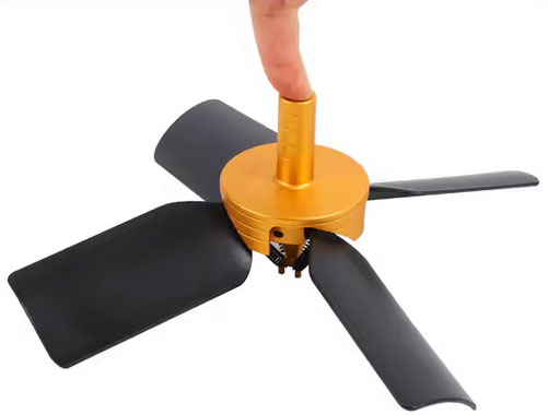 Im Stillstand halten Federn die Flügel kompakt zusammen – ideal für Werkzeugmagazine, auch bei horizontalen Aufnahmen. Mit steigender Drehzahl klappen die Flügel durch Fliehkraft automatisch aus und erreichen einen Durchmesser von ca. 260 mm. Ab etwa 3.000 bis maximal 7.000 U/min erzeugt der Propeller eine kräftige Luftströmung, die Späne und Kühlmittelreste zuverlässig entfernt.